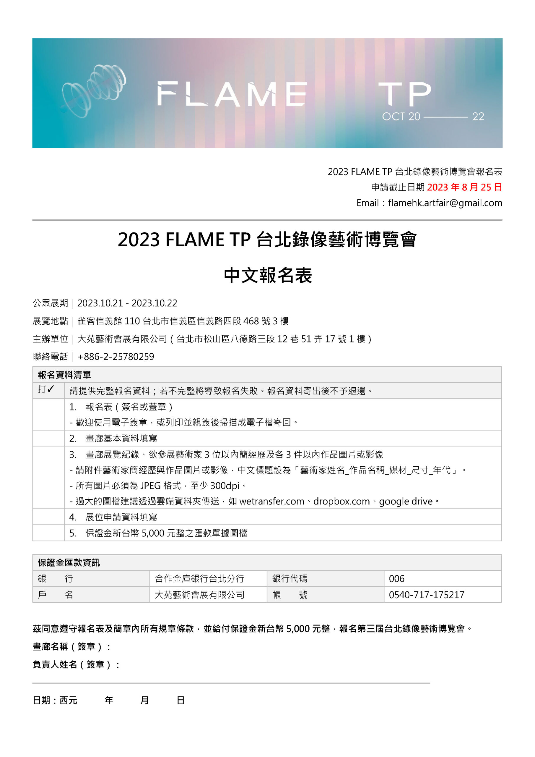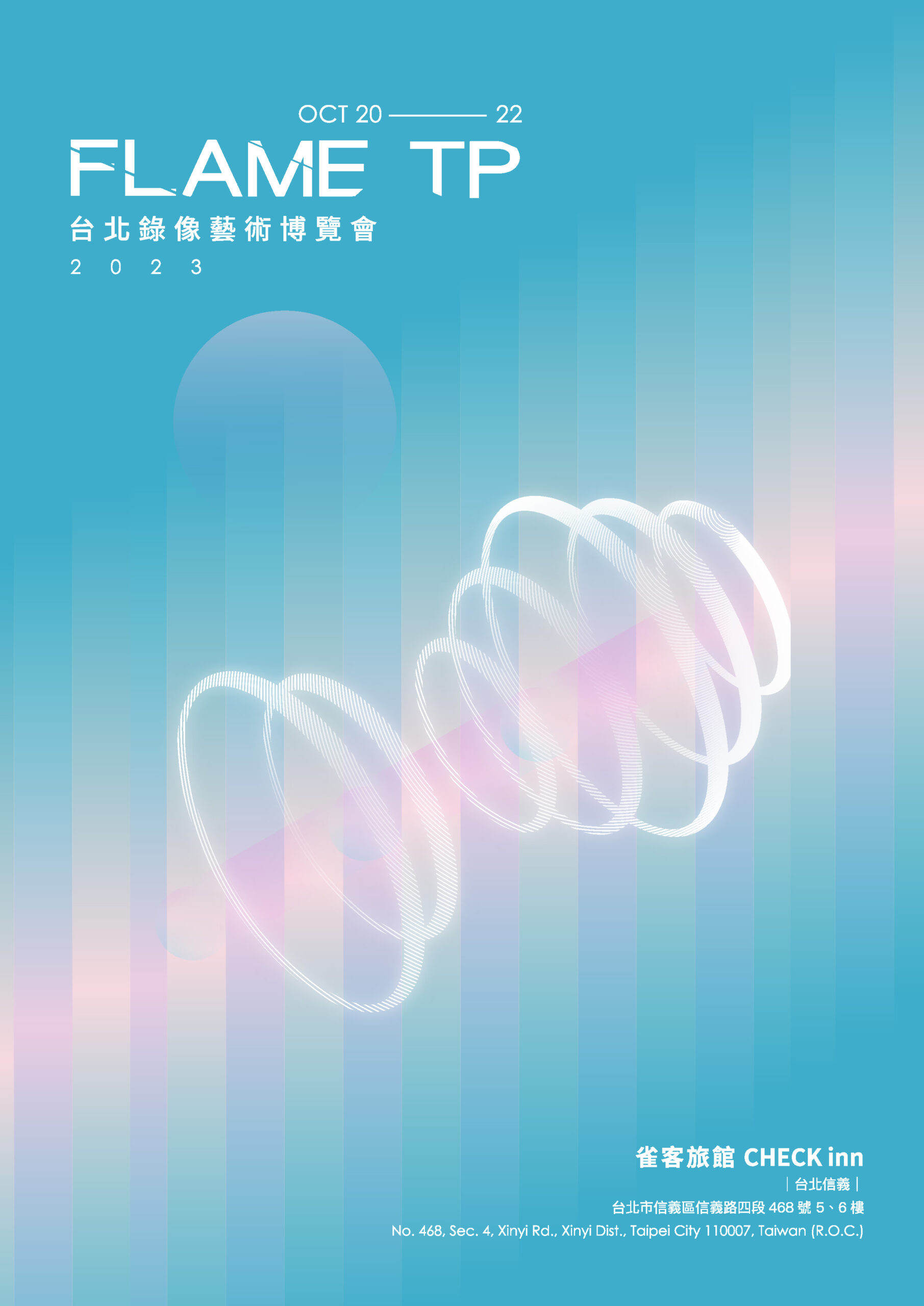 Fair Schedule 2023/10/19 Thu. 15:00 - 22:00 2023/10/20 Fri. 08:00 - 12:00 2023/10/20 Fri. 12:00 - 20:00 2023/10/21 Sat. 12:00 - 20:00 2023/10/22 Sun. 12:00 - 20:00 CHECK inn Taipei XinYi110 台北市信義區信義路四段468號5、6樓 Application Guide 2023 FLAME TP 簡章 2023 FLAME TP 報名表 Download 申請簡章 繁體中文版 LOGO (ai / 版本 2020 / 1.08MB)